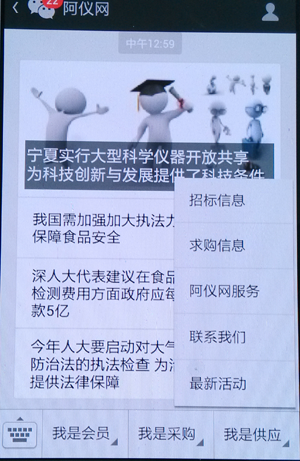 1、我是供應 菜單功能有:招標信息、求購信息、阿儀網服務、聯系我們、最新活動